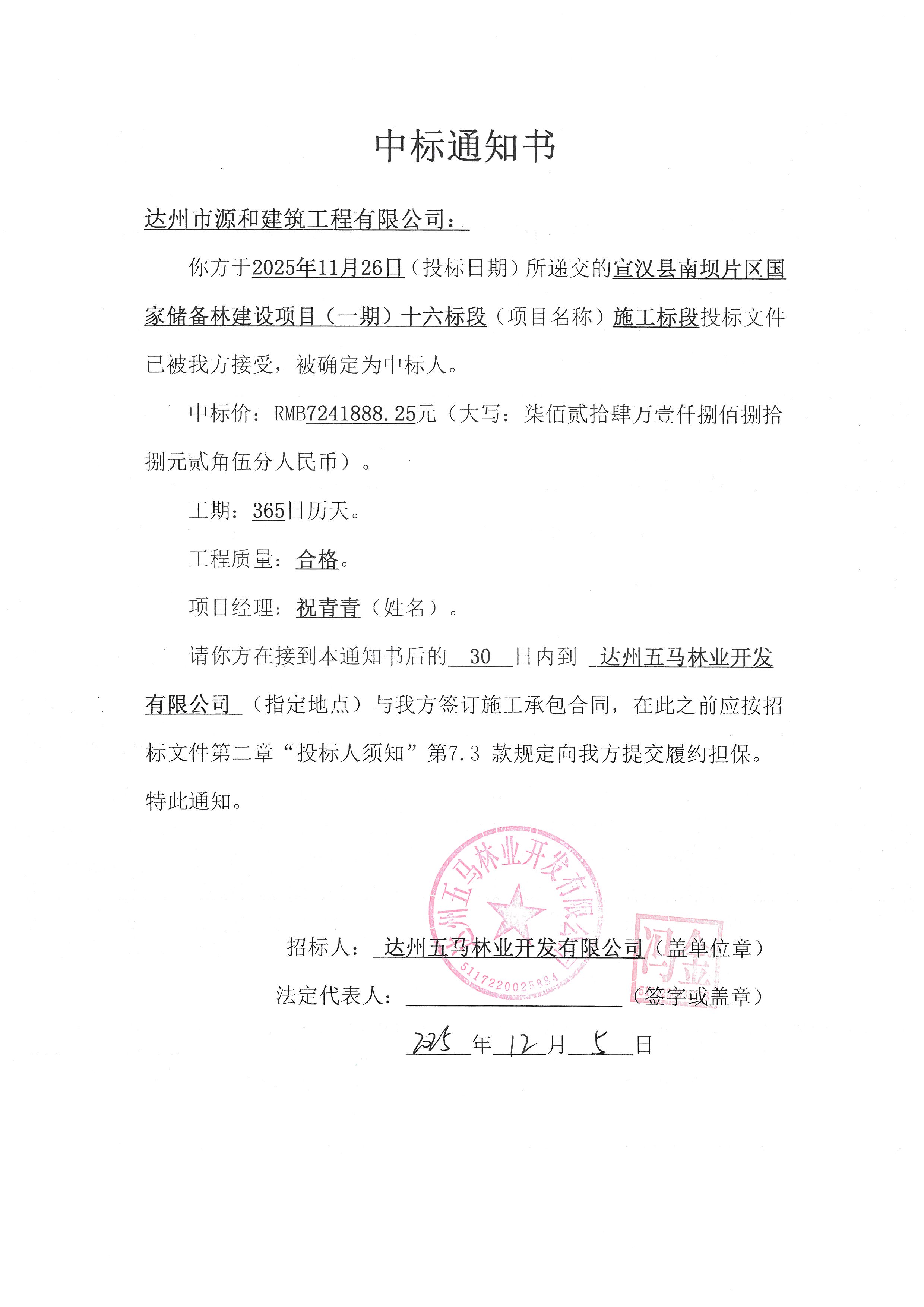 宣汉县南坝片区国家储备林建设项目(一期)十六标段/施工中标结果公告